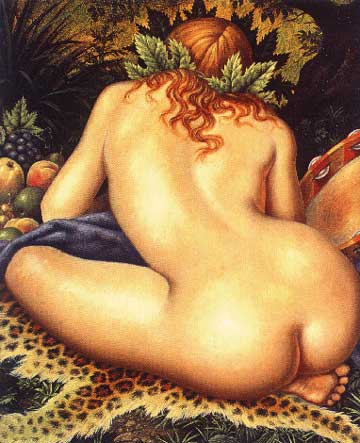 Throughout the Hague years, Johfra executed the occasional canvas with more Baroque and Mannerist themes. Some were Alpine landscapes, others were views of Roman ruins. But a classical nude such as Bacchante (1951) shows that, after five years, the eroticism in his works was mounting. If we view such a canvas as a mirror onto his mindstuff - giving shape to the substance of his imagination - then his dreams and visions had now become clearly focused onto atleast one unified shape - the erotic female nude.