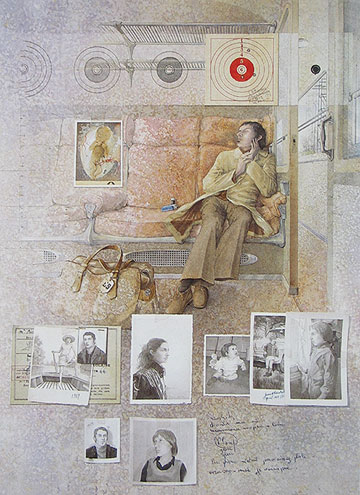 A self-portrait from this period reveals the artist as ambulant and a dreamer - travelling in a train compartment encumbered by photo snapshots of his more personal memories. In essence, the artist's
