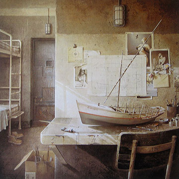 A fine example of this new genre of work is his 1983 painting Hope. The slanting sunlight across the wall reveals an empty chamber where someone has been hard at work, building a model ship from balsam and glue. Erotic photos, reminiscent of Poumeyrol's own early works, are taped against the wall. It is only when our eye wanders towards the barred door that we realize the hidden protagonist's sad predicament, and why the sailboat offers him such a desperate and futile 'hope'.