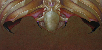 Eventually, Henricot's mummified figures entered into relationships with other extraordinary beasts: cerberus hounds, winged erinys or pre-historic pterodactyls. Indeed, these species altered and evolved to the point where their anatomies miraculously expanded and combined. Henricot demonstrates an extraordinary imaginative capacity to meld the ossified structures of man and beast.
