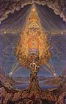 In the sky, we see a multitude of figures floating among the clouds. This fascination with multitudes of figures occurs in many of Johfras works. Here they may symbolize the many seeking their solution in the One. On the bottom left elves and gnomes are gathered - another life-long preoccupation. Meanwhile, on the right, shrouded figures invoke Christs parable from Matthew 25:1. Seven wise virgins await the bridegroom with lighted lamps, and seven foolish virgins cower in the darkness, their lamps extinguished. But Johfra has used this image in other works to suggest the initiates into the Mysteries. The figures on the right suggest Mystery religions, the others on the left more Pagan beliefs. Figures from each turn to face the flaming unity.