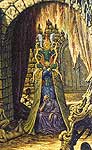 The ruins on the left are in shadow while those on the right are in the light. From the darkened ruins, a robed demon in green surveys his kingdom while, behind him, an obese naked figure is carried in on a divan. This is the kingdom of matter, flesh, passion and desire which, according to the Gnostics, is ruled over by numerous demons.