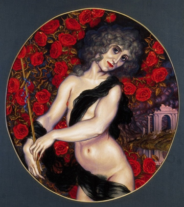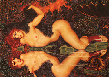 In Kalmakoff's Self Portrait as Narcissus (or Hermaphroditus), the decadent artist is forever frozen in this pose - gazing at himself longingly, male and female, apart and yet desiring to be one, knowing that their union would only bring tragic self-destruction.