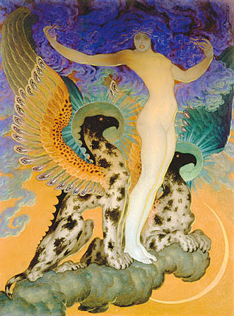 But, the affair did inspire in Kalmakoff a renewed vision of woman, resulting in some of his finest erotic works. His Astarte (1926 above) is charged with sexual energy: the nude goddess's outstretched arms emanate her eros across the heavens. The two griffons seated at her feet inspire majesty. The Syrian Goddess by Lucian reminds us that the original statuary of Astarte portrayed her standing on two lions (hence the gryphons) with a star or crescent moon (seen lower right) as her symbol.
