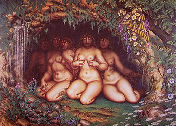 To survive, Kalmakoff took on a number of odd commissions. At least two small prayer cards of the type sold in churches have been found in Kalmakoff's style and signed with his trademark 'K' monogram. It was thus that the painter of Satan, Astarte and various erotic works found himself illustrating The Blessed Gemma and her Angel (c 1934 above) and Christ Child in the Sheeps Fold (1934 above). In the latter work, the infant Jesus bears a strange resemblance to Kalmakoff himself. Portrait of the Artist as the Christ Child?