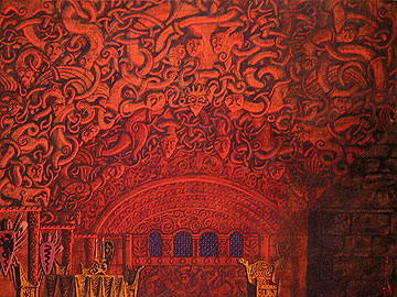Of his many stage settings, at least two designs have come down to us: The Serpentine Crypt of c. 1910 (a pastel co-signed by the Mir Iskousstva painter Bakst) and The Bedroom of 1914 (mixed media). Both reveal a Giger-esque fascination with intertwining serpentine forms, much-inspired by Nordic and Celtic weaving patterns.