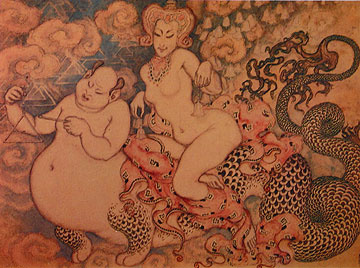 While Three Black Women(1912, mentioned earlier) recalls Hindu figures and postures, his Woman and Buddha(1924, above) displays the influence of Buddhist art in the Japanese style. It is this fascination with the subjects and styles of ancient cultures that makes Kalmakoff's work transcend his own period and become truly Visionary. Kalmakoff begins in the Jugendstil or Art Nouveau style of his times, but - like Moreau, Delville and Fuchs - he evolves beyond it, allowing his line to echo and resonate with the different styles of more distant cultures.