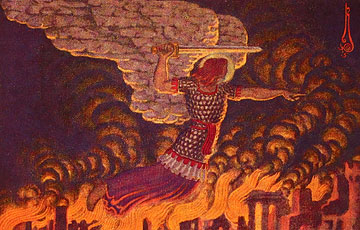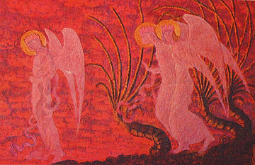 Though Kalmakoff preferred a cloistered existence in order to pursue his timeless visions, he could not help but respond to the ravages of war which were breaking all around him. One response was to produce a series of five lithographs. The profits gained through the sale of these postcards were donated to the Society of St. Eugénie, the Russian version of the Red Cross. These four images possess an undeniable beauty. The angel of The Sleeping City(1917) calls upon the inhabitants to awaken. But, in the Evening Light(1915, above), three angels look down from a flaming red sky with unease and disarm at the spectacle below. Then, in The Heavenly Wrath(1915, right) another angel flies across the sky with the city below in flaming ruins. Still, it points its sword towards victory in the future. In the last of the series, called Paradise (1915), a sole angel smiles as she promenades through the promised paradise.
