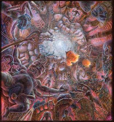 Considering this, it fascinates me to wonder why I could not begin. For mysterious reasons, I was bound to render the older visions first. So, for seven years now I have steadily painted apocalypses - with glimpses of the unattained paradise burning behind their tattered veils…. |