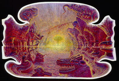 Gazing at the gray drawing, I was transfixed. Flat, colorful patterns swam on its surface, ironing away all subtleties and illusions of depth. The bright patterns conformed linearly to the penciled forms, but the towers no longer leaned into the sky with a dizzying effect; the figures no longer loomed. Instead they appeared distorted and flat. Even the meaning of the picture was lost to bold abstractions. For a little while I watched the patterns swim and change, but they remained too garish to enjoy. It was unpleasant to watch such subtle rendering turn to bright mosaics. It was too early to expect otherwise, though. I was still in the waiting room of the trip, where walls of pattern and color barred the entrances to spacious worlds. |