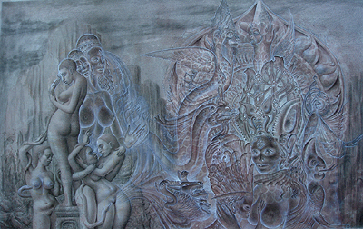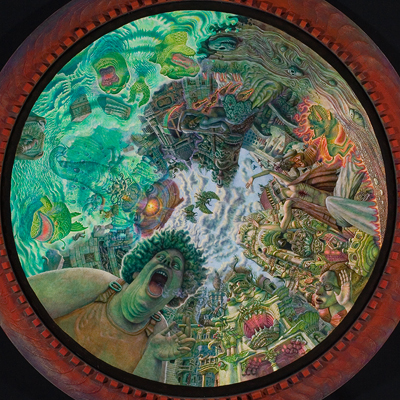 Opening my eyes, I returned to physical reality. I was in the front room. On every wall, paintings hung or leaned at crazy angles, presenting themselves like flowers… I went to the one on the easel. It was a large round painting, newly begun, later called Thanatos Wave. At this early stage it was monochrome: a faint bluish violet veil of images. Figures in the foreground bulged toward the viewer as if through a fisheye lens. Behind them a seismic wave crashed into a city of screaming carnivorous buildings.