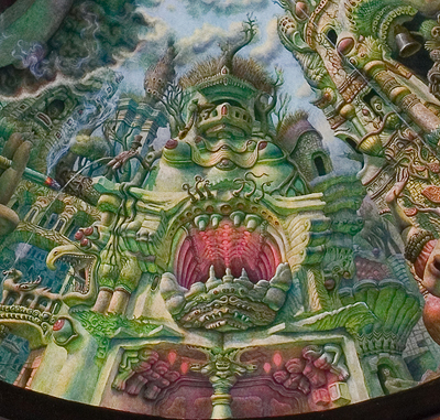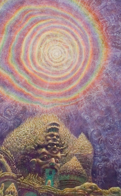 Storms rolled across the dim landscape; clouds released lightning into the temples’ pinnacles; shafts conducted the electricity deep into the earth’s caverns, where it condensed into pools. Night fell. Out of the electric pools arose a mist of phosphorescent forms: coiling dragons and all manner of mysterious tableaux…