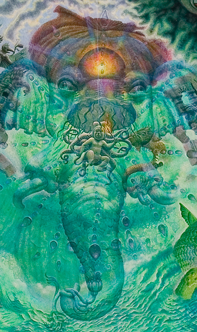 At some point in the early morning I sat at the table and began to embellish the drawing, My Birth in a City of Strange Monuments. The largest figure, an incandescent face and a hand holding a shell, slightly resembled the women of the cosmic mountain. I penciled the delicate ornaments of her headdress, and gave her strange light to some of the cyclopean towers.