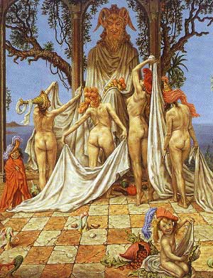 Johfra's fascination with the Horned God goes back far in time, as an early work such as Satan's Pleasure Garden testifies. But the Horned God makes his greatest appearance in a massive triptych which Johfra laboured upon day and night in 1979.