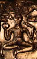 And in a large canvas with hundreds of figures called The Enchanting World of Cernunnos (1993) above, we meet with the Horned God of the Gauls exactly as he was depicted in the Gundestrup cauldron (left) with the stags antlers on his head, and holding a ram-headed snake in one hand and a necklace in the other.
