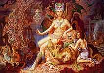 The crescent moons relate to the three faces of Hecate which also appear in this painting. Since time immemorial, the moon has offered us a very ancient image of woman: its three phases reflect the three stages in the life of woman. The crescent moon, when it is waxing, symbolizes the virgin, who appears below Hecate to the right, offering her a cup. When the moon is full, it symbolizes the mother, who appears as Hecate herself, the ancient source of abundance. And the crescent moon, when it is waning, symbolizes the crone, who appears below Hecate to the left, as an old woman piercing a baby with a needle. There is also a fourth phase, the dark moon, when the moon disappears from the heavens, and she is present in Johfras painting behind Hecate, as the shrouded old lady with depleated breasts.
