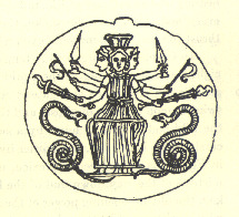 An engraved gem from Roman times depicts Hecate as crowned, with three faces, and sitting between two coiled serpents. She has six arms, and in her six hands she holds two torches, two goads, and two knives. These motifs recur in Johfras painting. His Hecate holds a sceptre with a torch at the top, two crescent moons and two entwined serpents.